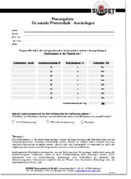 Für die Angebotserstellung benötigen wir Daten von Ihnen. Bitte übermitteln Sie uns deshalb die vollständig ausgefüllte Planungsliste. Diese Bedarfsermittlung ist Voraussetzung um Ihnen eine ausfallsichere PV-Inselanlage zu entwerfen. Sie fragen - und wir finden die richtige Lösung für Ihr Vorhaben.